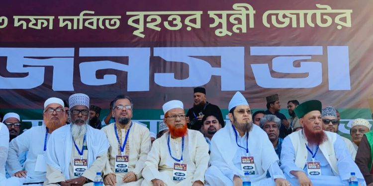 জাতীয় নির্বাচন বানচাল হলে দেশ ভয়াবহ বিপর্যয়ের মুখে পড়বে।আগামী ফেব্রুয়ারিতে ঘোষিত জাতীয় নির্বাচন নিশ্চিত করা, রাষ্ট্রীয় সংলাপে এবং জুলাই সনদে সকল নিবন্ধিত রাজনৈতিক দলকে অংশগ্রহণের সমান সুযোগ দেয়া, দুর্নীতিবাজ কালোর টাকার মালিক ও দণ্ডিতদের নির্বাচনে অযোগ্য ঘোষণা করা, মাজার মসজিদ খানকায় হামলায় জড়িতদের বিচার, জুলাই বিপ্লব ও পরবর্তী সময়ে সংঘটিত সব হত্যার বিচার করা এবং মবসন্ত্রাস থামানো সহ ১৩দফা দাবিতে ১৫ নভেম্বর শনিবার বিকালে চট্টগ্রাম লালদীঘি ময়দানে বিশাল জনসভার আয়োজন করে বৃহত্তর সুন্নীজোট চট্টগ্রাম জেলা।